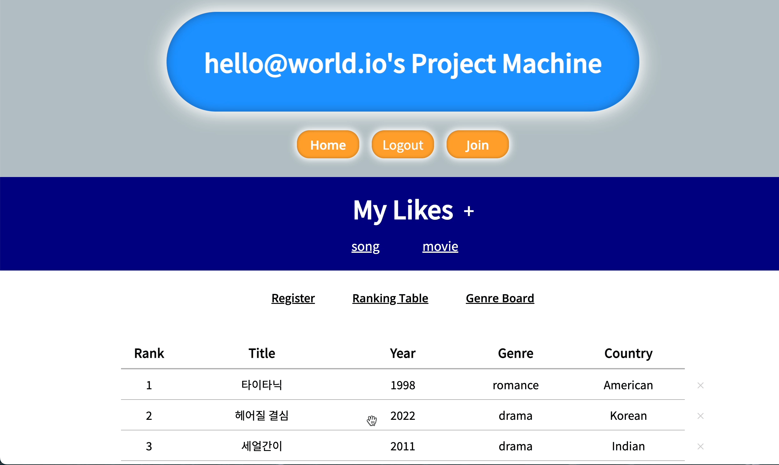 처음 테이블 목록은 1위 타이타닉, 2위 헤어질 결심, 3위 세 얼간이이다.